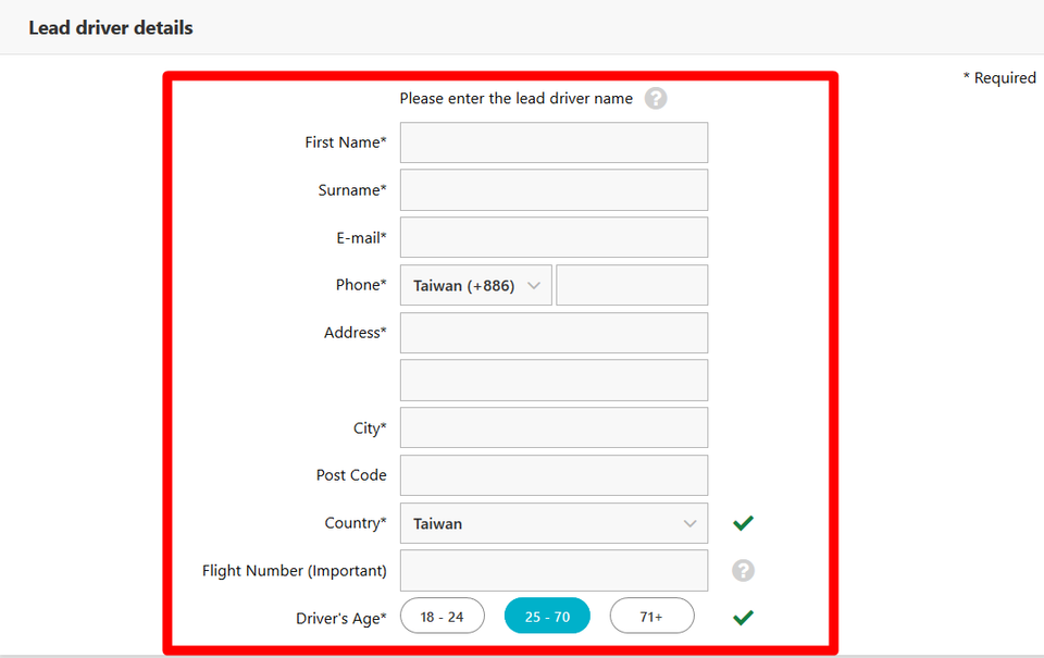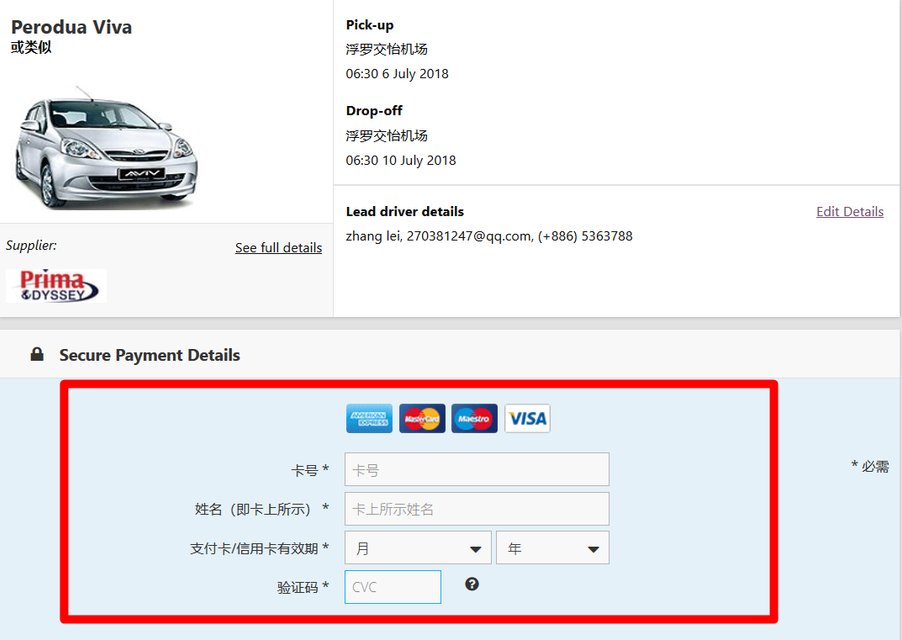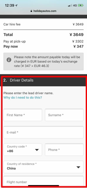通過Skyscanner租車比價功能,確定好自己所選的車型、價格等車輛訊息後,根據提示填寫司機信息,包括姓名、郵箱、電話、國籍、地址、郵箱、航班號等。