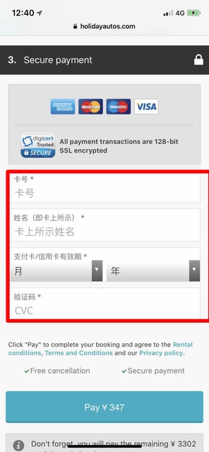 將個人填寫完後,將跳轉至付款頁面,用戶需要輸入正確的卡號、姓名、支付卡有效期以及CVC碼,完成預訂。