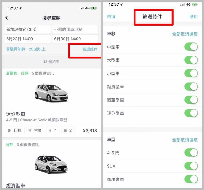 用戶還可以選擇「篩選條件」按鈕,選擇車輛的車款、車型、貨卡、特色、燃油正常、提供商家評價、傳動、預訂網路等條件快速搜索出想要租的車輛信息。